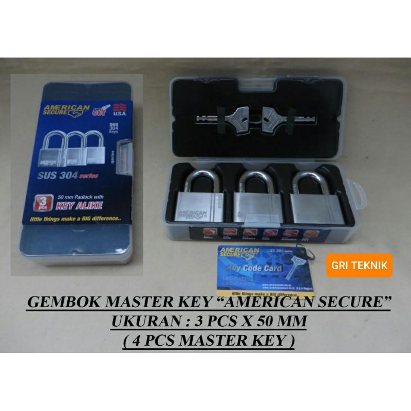 Foto hasil jepretan senGembok master key 50mm isi 3pc merk American Secure.Size 50mmMaximum Security :- Anti potong, anti bor, anti linggis, anti palu, anti cairan setan- Material stainless SUS 304 series anti karat.- GRADE 9 Lock Global Protection Standard- IP68 Weather Proof* Anti Drill* Anti acid* Anti hexkey* Anti saw* Anti hammer* Anti pryProduk termasuk :- 3 pcs gembok - 4 pcs kunci master- 1 key code card *key code card harap disimpan untuk pembuatan anak kunci apabila anak kunci hilangBarang Original.Foto sesuai dengan barang yang dijual ( foto hasil foto sendiri )Ini link video nya di Youtube https://youtu.be/Hbs2-f
